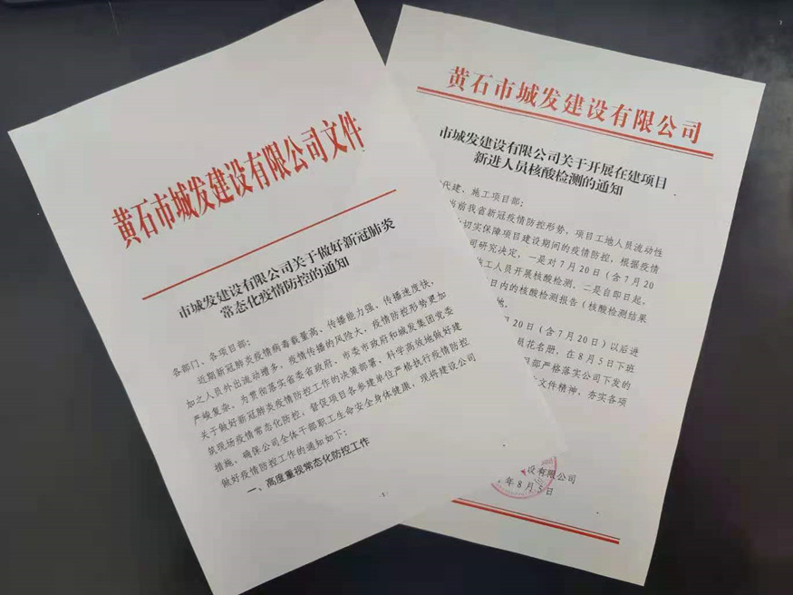 鑒于項目工地人員密集,流動性大的特點,8月5日,公司印發(fā)了《市城發(fā)建設有限公司關于開展在建項目新進人員核酸檢測的通知》,為切實擔負起防疫抗疫責任,有效降低人員流動引發(fā)的疫情傳播風險,要求7月20日以來新進項目員工須持3日內合格核酸報告進入項目工地。